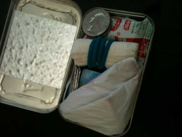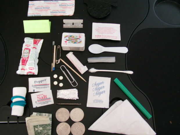 Mi kit es el único que contiene algunos conceptos esenciales para la supervivencia urbana que no he visto en otros equipos. Algunas de mis cosas favoritas son una mini baraja de cartas, un par de gafas de sol y un paquete de salsa de tomate. Mi kit contiene 30 artículos únicos (31 si contamos la lata sí mismo), que son cosas muy útiles.