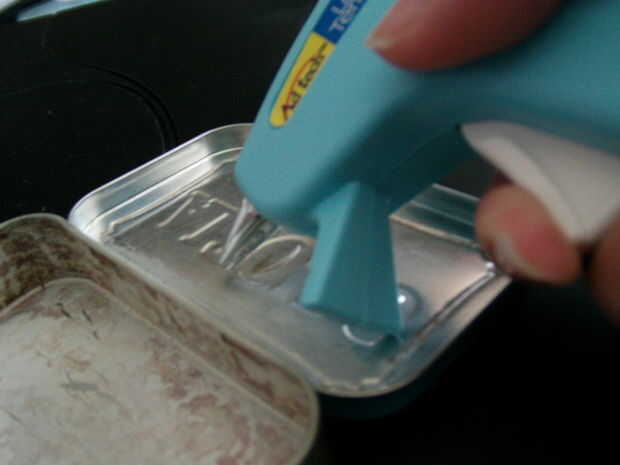 Desea colocar el espejo en el interior la tapa superior. Una lata limpia y seca permite una adherencia óptima. He utilizado pegamento caliente pero hubiera preferido un tipo más fino de goma que quedaría bien. Trate de dejar un poco de espacio entre los bordes del espejo y los bordes de la lata para que la tapa todavía se puede abrir y cerrar fácilmente.