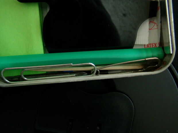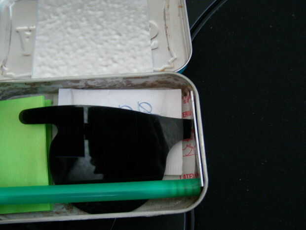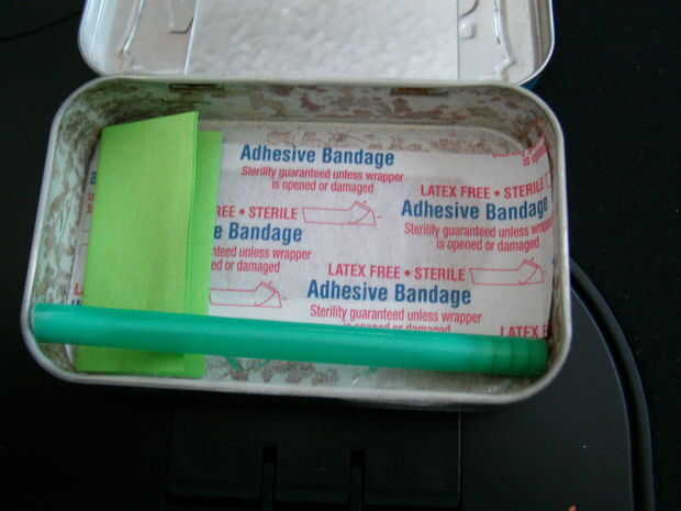 Me gusta poner cosas planas como curitas y gafas de sol en el primero. También me gusta embalar cosas como la paja que ocupan toda la longitud de la lata. Puse cosas pequeñas como el palillo de dientes y el perno de seguridad entre la paja y la parte delantera de la lata porque hace una pequeña sección. Puse la hoja de afeitar contra el borde derecho de la lata, la cuchilla abajo, por razones de seguridad. Me gusta rematar la lata con cosas de smoothy como la bolsa de plástico.