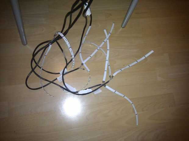 Simplemente soldar un cable para cada canal y un cable de ánodo común (12V). Cada tira tiene que tener cuatro cables. Utilicé cable red viejo porque fue tiempo suficiente para cortar en pedazos y tiene 8 cables en él. Eso es muy bueno porque necesitamos 4 cables por canal y que quería hacer pares para reducir la cantidad de cables detrás de mi tv. El cable también cuenta con una capa bien así que sólo tengo un cable más grande en lugar de 8 individual por par. Ahora tengo cuatro pares de tiras y dos individuales (parte inferior). Asegúrese de que los cables solicitados sean lo suficientemente largos para que la unidad de control no flota detrás de la pantalla.
