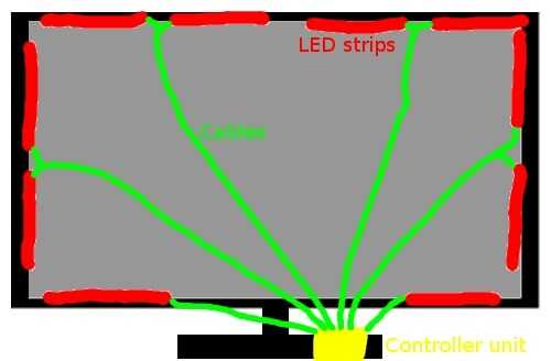 Quería tener 10 áreas en total así que tuve que cortar a lo todo largo (5 metros) en 10 tiras más cortas. ¿La pregunta era cuánto shell sean? Para tener una idea, os adjunto una imagen para que pueda ver donde grabado las tiras a la parte trasera de la pantalla de mi tv después de terminar el proyecto. Como se puede ver, una sola pieza debe tener la longitud de 25cm para asegurarse de que hay suficiente luz, pequeñas distancias entre dos tiras y no se superponen. Corresponde a los resultados medido para la corriente máxima. Así que al final todavía tenía 2,5 metros de izquierda de la tira de LED, que fue revendido en ebay.