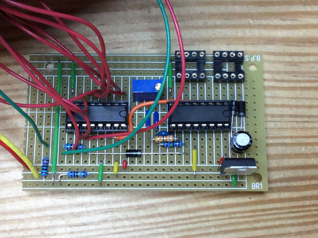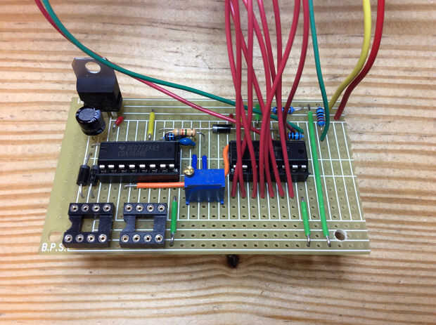 Los cables rojos positivos de los LEDs de la viruta del IC 4017 en el circuito de la soldadura.