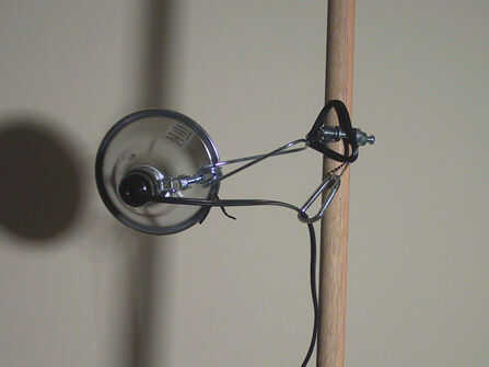 Con unos 6" de la cadena o la cadena, hacer un lazo alrededor de la abrazadera C y pasar el cable de la luz a través de él. Esto hará que la cuerda correr bajar el eje, reduciendo las posibilidades de alguien tropezar en el cable. En la imagen adjunta, usé una cadena y un mosquetón para sujetar el cable, en lugar de cadena. El carabinero hace montaje y desmontaje fácil. (perdón por el juego de palabras)