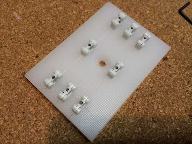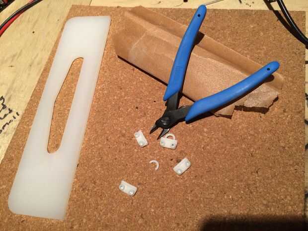 Tiempo para modificar los planeadores. Tendrá que cortar los lazos poco, intentar cortarlas tan al ras como sea posible así habrá menos lijado para hacer. Usted necesitará estos de arena para que queden planas en la parte superior, envolver un trozo de papel de lija alrededor de un trozo de madera y frote la vela en él, no hace falta mucho así que ten cuidado para que no sobre la arena lo. Ahora perfore un agujero a través de ellos el tamaño adecuado para la toma que se utiliza para añadir a la cesta, estos toque con la mano y luego atornille los. No endurecer aún, dejarlos un poco flojo. ahora a ver si cabe en el riel. Si va en grande! Apriete los planeadores y prueba otra vez, puede que necesite para violín con ellos un poco para conseguirlos todos alineados pero debe ser rápida.