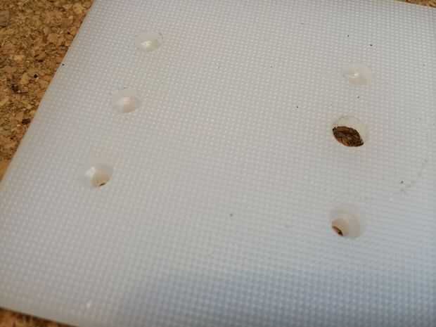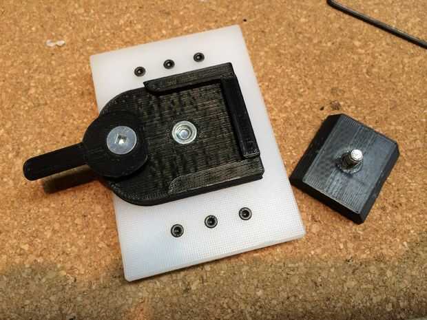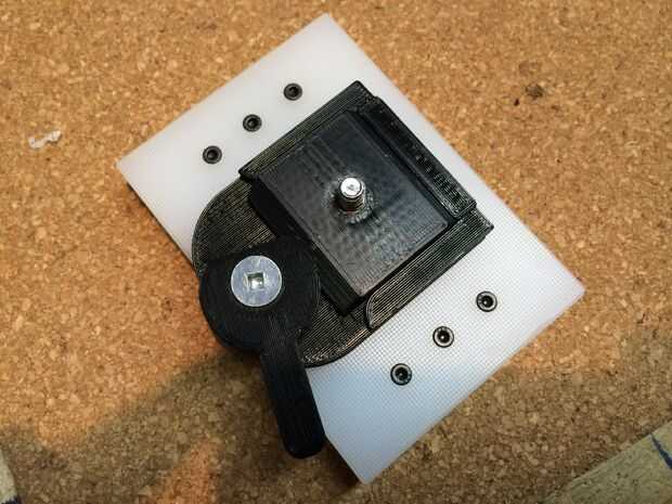 Primero marque el centro de la cesta y el orificio de tamaño adecuado para lo que vas a montar en él, perforé un orificio de 1/4". Usted tendrá que utilizar un tornillo con cabeza cónica para fijar tu cámara o cabeza y se debe avellanar el tornillo para que no toque el carril, si toca el riel tendrá un mal momento. A continuación marcar y taladrar los agujeros para los planeadores.