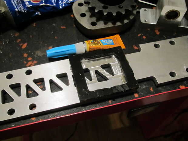 La primera fue añadir relleno a la zona el accesorio giratorio se póngase en contacto con el panel frontal. Usé algunos 3/16" hule grueso cortado en forma de un cuadrado hueco y pegado a la placa de aluminio. La pequeña área embolsada fue agregada para permitir el uso de la rpm baja opcional doble pulido discos, como el eje principal arma cepillo contra la placa de aluminio cuando se hila de forma continua.