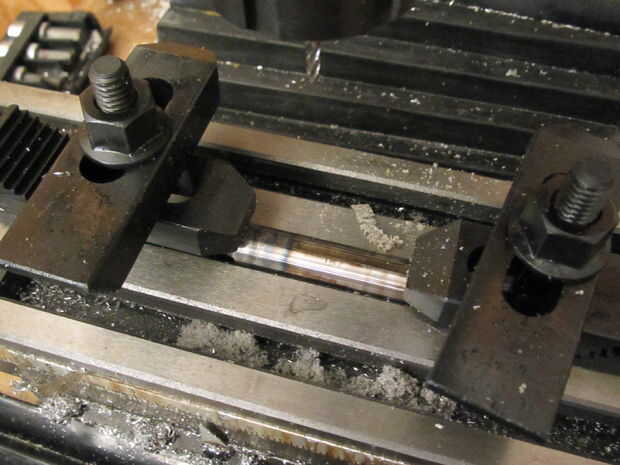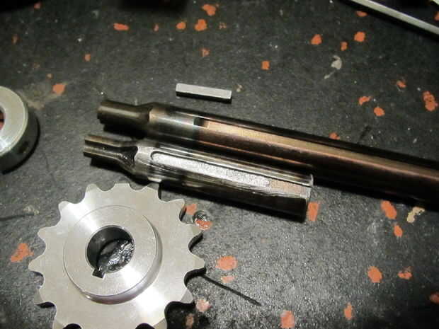 El piñón del arma necesario para sentarse más cerca del motor del arma de la ranura existente permite y sin una brocha disponible, opté por usar un mini-molino con una fresa de 1/8" para ampliar el área de la ranura. El eje se sujeta a la mesa con la ranura existente sentado más o menos nivel. La fresa fue traído en la ranura del chavetero y alineado con las verticales paredes de la ranura. Utilizando velocidades del husillo baja y algunos fluidos de corte es fácil ampliar la ranura. También he incluido una foto del eje modificado al lado de un eje común para la comparación.