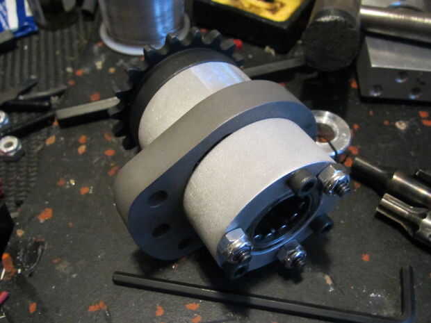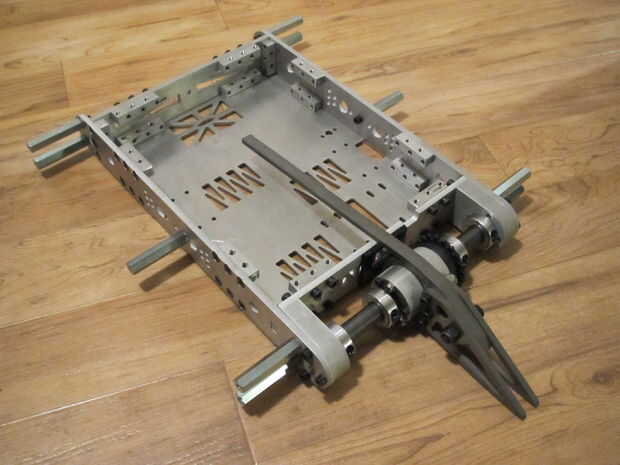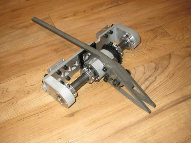 El eje del arma fue atornillado y lo 3/4" acero eje tubular (1/8" pared, 9,875" largo) era deslizarse a través de la Asamblea. Se añadieron dos collares de eje a cada lado y los dos bloques se resbalaron en los extremos del eje. Estos bloques fueron empernados al panel frontal armadura bloqueo a la Asamblea. El eje del arma se centró en el eje y los collares del eje fueron bloqueados en el eje y rodamiento de bloques para evitar que se mueva de lado a lado.