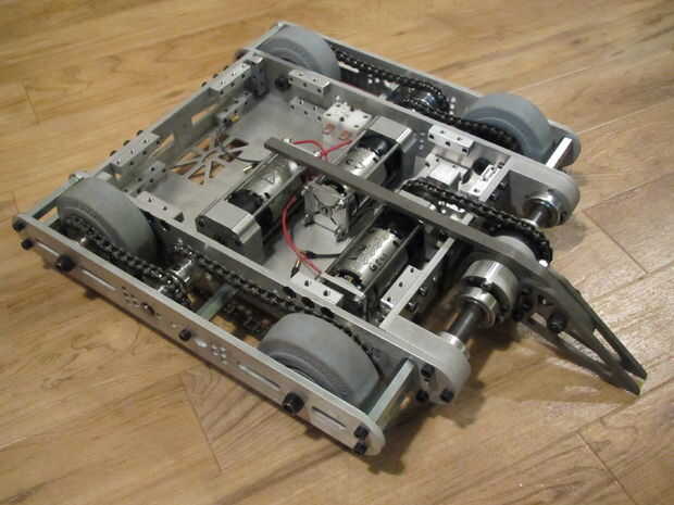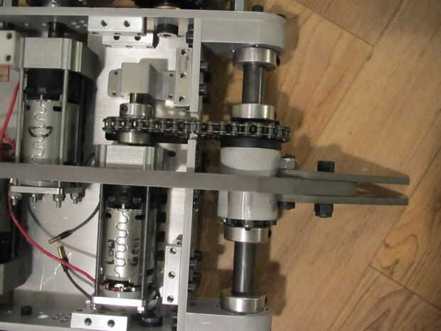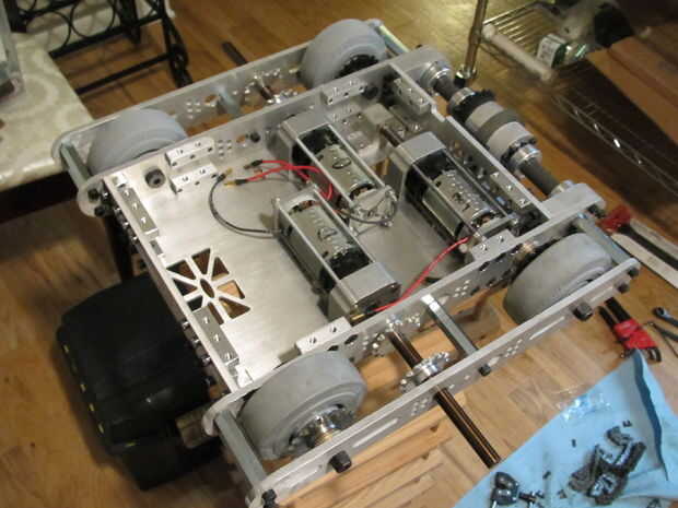 kits del sistema de mando de dewalt fueron empernados a la placa base. Estoy usando el kit de retenedor opcional de motor con la varilla roscada de acero stock reemplazada con un ahorro de peso de 3,6 oz de aluminio. Después de eso, los rieles exteriores fueron empernados a la estructura. pernos de 1/2" de hombro se agregaron con el extremo roscado en la parte exterior de los protectores de la rueda exterior. Una vez que se agregaron medidas tomaban averiguar cuántas arandelas necesitan a agregar. Los protectores de rueda exterior fueron quitados, permitiendo la adición de las arandelas, las ruedas y el eje, que sí mismo había arandelas, collares de eje y afinado piñones en él. Una vez que todo esto se añadió el panel externo fue reatado. El eje del motor del arma entra en un pillowblock de aluminio de chatarra, el diseño exacto depende de ti si replicarlo, lo único importante es el buje o rodamiento utilizado en él debe ser 1" por encima de la placa base.