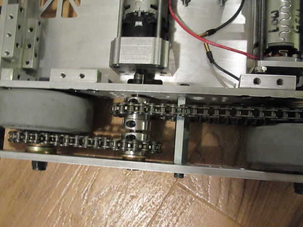 El siguiente paso fue medir y cortar la cadena. Primero alineados todos los piñones con las ruedas y el arma, luego tomé la longitud de cadena del rodillo que tenía y envuelto alrededor de la sección para determinar donde tenía que romper. Una vez que la cadena se rompió en la longitud adecuada, lo envolvió alrededor de nuevo y añadido los links maestro. En este punto, el montaje mecánico es completado.