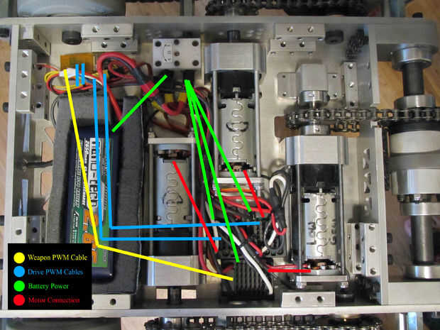 Los tres controladores de BR-XL son velcro a la placa de base entre los tres kits de sistema de mando de dewalt. El lado del motor de los controladores de que cada uno se conecta al 1 motor, positivo en el lado de la batería va en el interruptor MS-1, que tiene el cable positivo de la batería conectado al otro terminal. El cable de negativo de cada controlador se conecta directamente al cable negativo de la batería. Los cables de accionamiento PWM conectan el mezclador V-tail, que luego se conecta a los puertos de Ail/Ele en la rx. El cable de arma los controladores PWM va directamente al puerto del timón en la rx. Una luz de encendido construida un alto rendimiento LED y un resistor está conectado de la misma manera como los cables de la corriente para los controladores de motor.