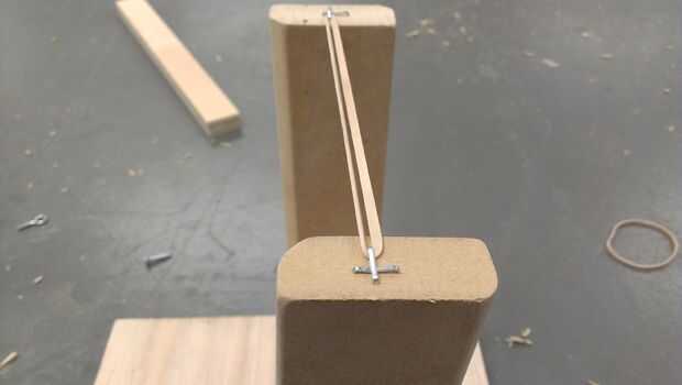 Usando la pistola de grapas, fijar por una banda de caucho a través de las tapas de los soportes laterales. Asegúrese de no realidad pinche la goma con la grapa, debilitar severamente la goma e inevitablemente hacerlo rápido. Si mantener la goma plana contra la madera y centro de la pistola de grapas sobre él perpendicularmente, se debe colocar la grapa va alrededor de la goma y permanentemente lo asegura en su lugar. Si la goma se rompe de uso extensivo, grapa a otro hacia abajo y está como nuevo.
