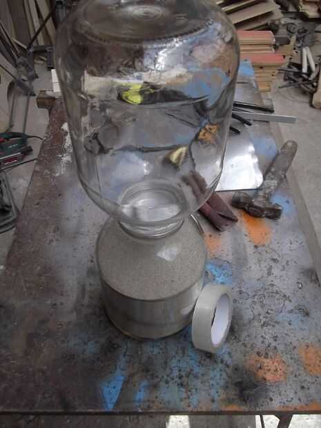 Antes de la arena en la unidad de sellado, hay que secarlo completamente. Para ello utilizan horno. Usted puede utilizar sol, si hay alguna, o incluso fuego. También antes del sellado, usted tiene que encontrar la cantidad adecuada de arena para duración deseable. Tómese su tiempo, la arena tamizada la unidad de preasembled, cuidadosamente voltee la unidad hacia abajo y compruebe que tarda. Añadir más arena o quitar algunos y vuelva a intentarlo. Lo hice tres veces. Cuando la prueba haya terminado, selle la unidad wraping cinta adhesiva transparente alrededor de la articulación.