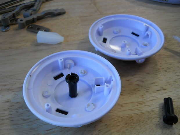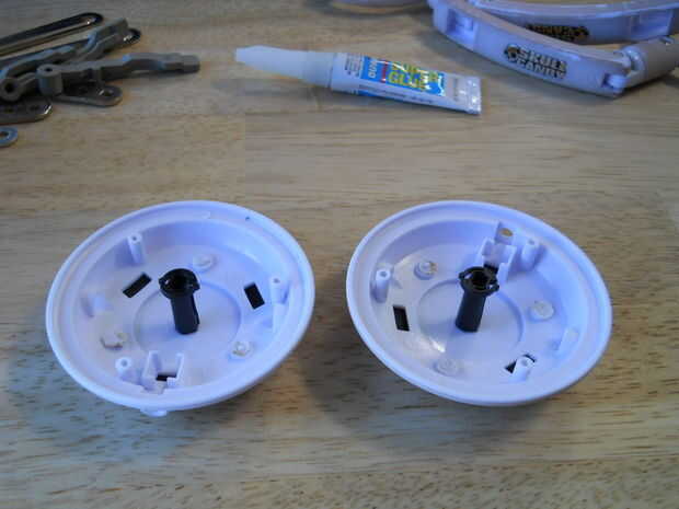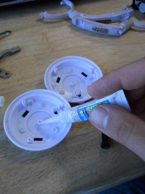 Luego, hice las ruedas, colocar la botella de plástico de las jeringas, en el centro de las piezas circulares de los auriculares. He utilizado pegamento.