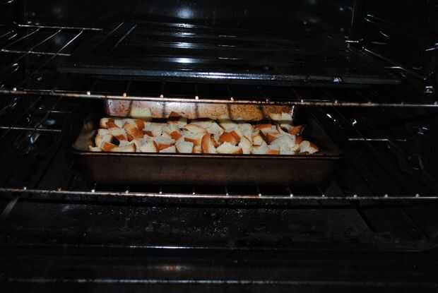 Primero desea tostar su pan. Usé un horno y corta el pan en trozos pequeños. No utilizar pan duro, porque entonces su relleno se sabor... bueno, rancio!
