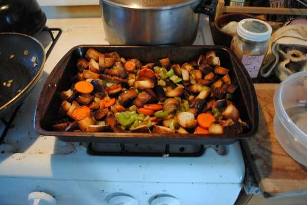 a continuación, agregue las verduras y especias al pan tostado. Luego añadir algún caldo para hacer está mojado. Cueza al horno la mezcla otra vez para unos 15-20 minutos a 300 grados hasta que esté blanda y agradable.