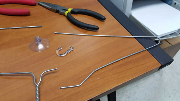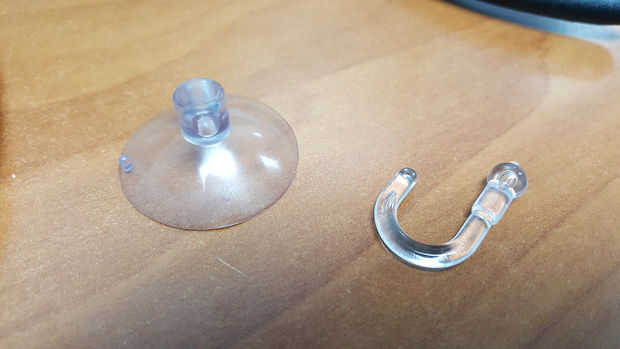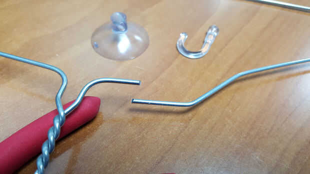 Retire el gancho plástico de taza de la succión. Corte suspensión en 2 puntos de fabricación de longitudes iguales.