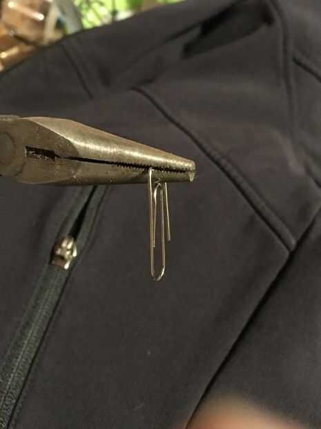 Tuve que ajustar un poco el clip y aplanar en un extremo de otra manera no sentarse correctamente en el zip. Smoosh simplemente con las pinzas y está bueno para ir.