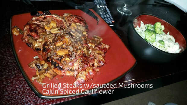 Cena: bistec a la plancha * w/salteado de champiñones, asar batatas,