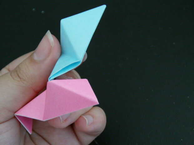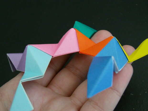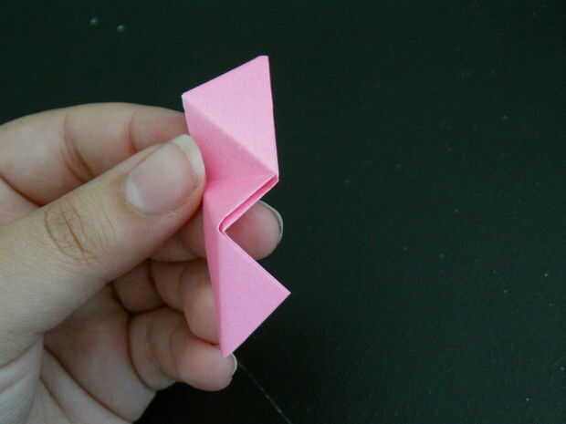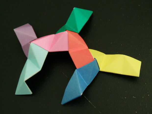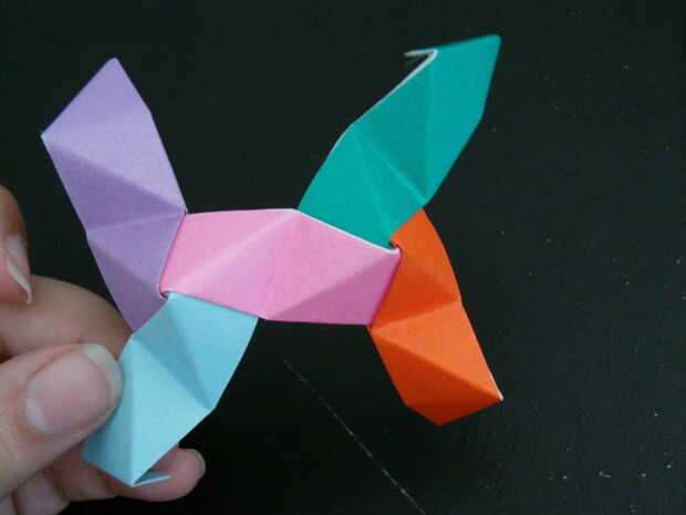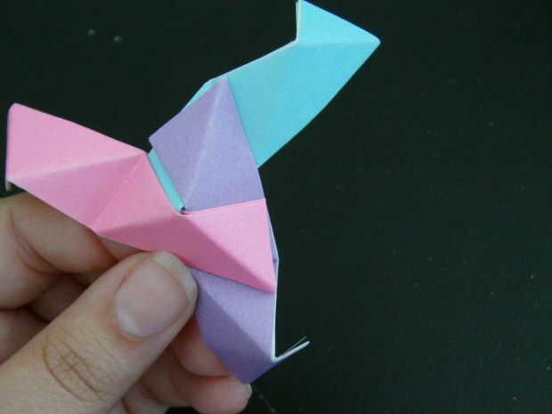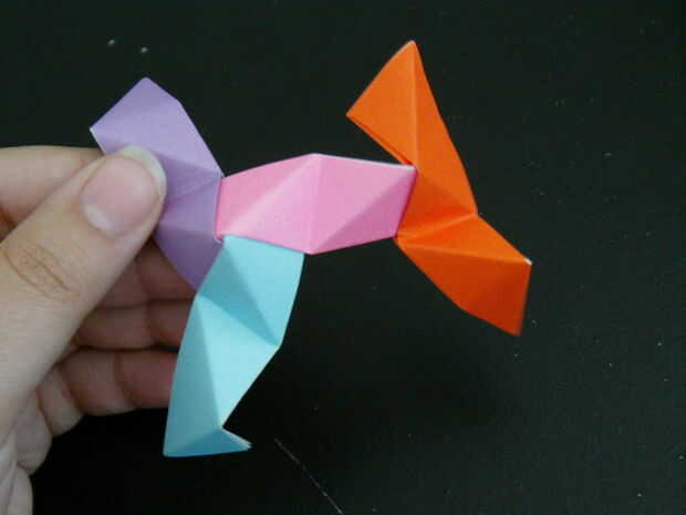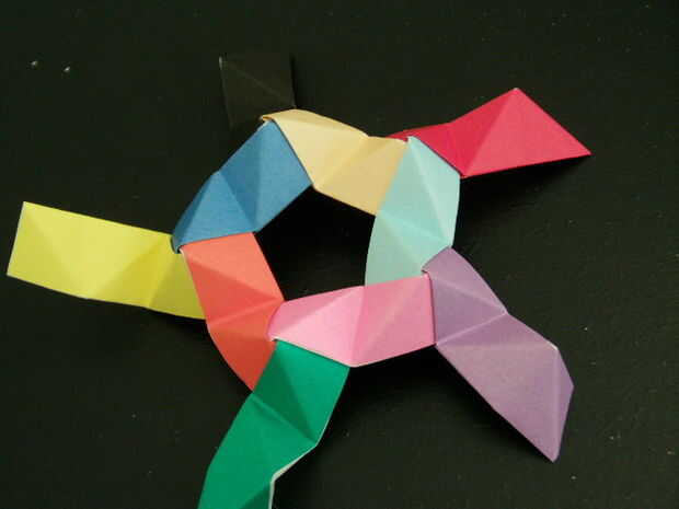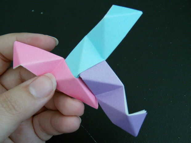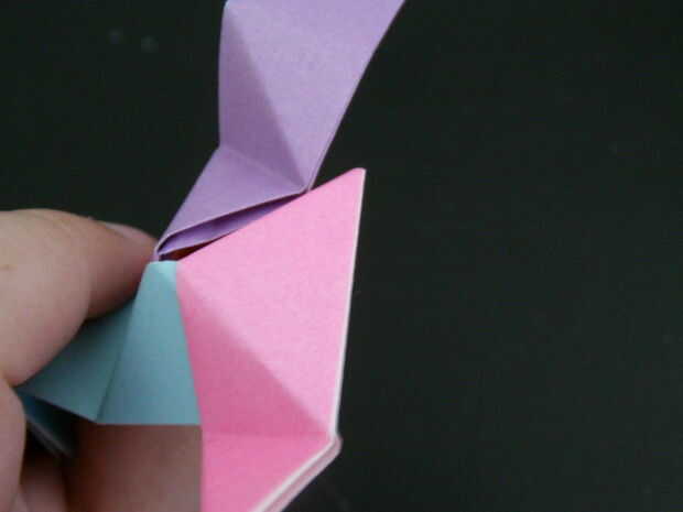 Las tres piezas que forman un pico triangular. Seguir añadiendo más unidades de esta manera crear más picos triangulares. Finalmente un anillo comenzará a formar, esto es una buena cosa. Seguir formando el anillo hasta que tenga una forma de Pentágono como se muestra. Para hacer la bola solo tienes que seguir añadiendo a esta anilla para hacer más anillos Pentágono y finalmente se forma una bola.