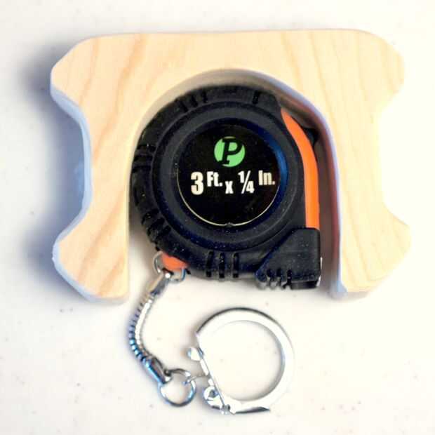 Traza la forma de la cinta métrica en un pedazo de madera un poco más gruesa que su cinta de medir y cortar una forma similar a la que se muestra. No se trata de un paso de alta precisión. Un agujero para almacenar el tornillo final puede perforar más adelante (cuando se sabe donde caerá) si lo desea. El resultado es que todo cabe en un poco menos espacio que una lata Altoids.
