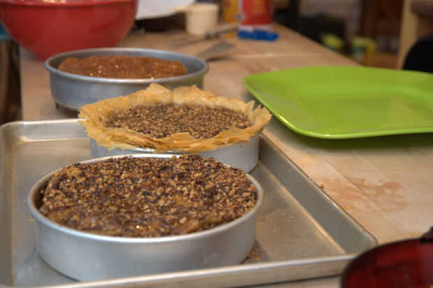 Una vez se haya enfriado el baklava, cuidadosamente quitarlos de las cacerolas por invertir en rejillas de alambre. Entonces cuidadosamente apilarlos para un homenaje a Pi imponente, matemático!