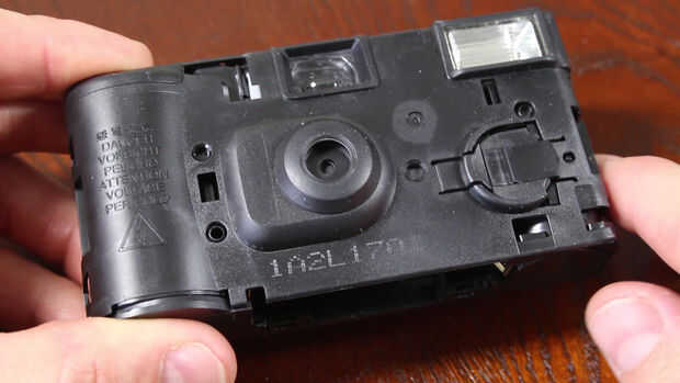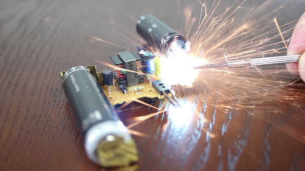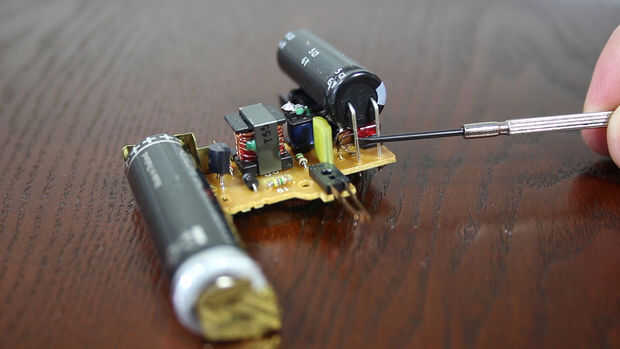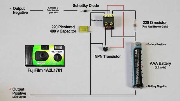 Apertura de la caja, encontrarás una placa de circuito. Esta placa unidades flash de la cámara y carga un condensador electrolítico con 330 voltios. Probablemente obtendrá sorprendido le si usted toma hacia fuera pelado manos. Para evitar que dio una sacudida eléctrica, use un pedazo de metal a cortocircuito en los cables de 2 en el condensador, como se ve en las fotos.