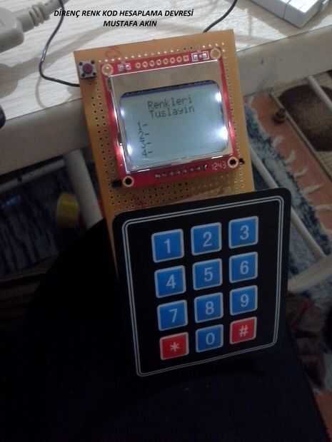 hijo renk koduna bakılarak tölerans değeri hesaplanır. nokia_gotoxy(6,1);nokia_printchar("Tolerans=%"); Si (direnc [3] == 10) nokia_printchar ("5"); Si (direnc[3]==11)nokia_printchar("10"); } //basılan tuşun değeri renk olarak diziye eklenir. void renk_ekle (void) {nokia_gotoxy(15,tus_sayi+2); tablo (direnc[tus_sayi]); tus_sayi ++; tus = 0;} //Ekran satırlarını siler ve satırlara 1,2,3,4 rakamlarını yazar. anular ekran_temizle(void) {char i, j; para (j = 0; j < 2; j ++) {nokia_gotoxy (0, j); para (i = 0; i < 14; i ++) nokia_print(' ');} para (me = 1; me < 5; i ++) {nokia_gotoxy(3,i+1); nokia_print(i+0x30); nokia_print('-'); para (j = 0; j < 9; j ++) nokia_print(' ') ;}}