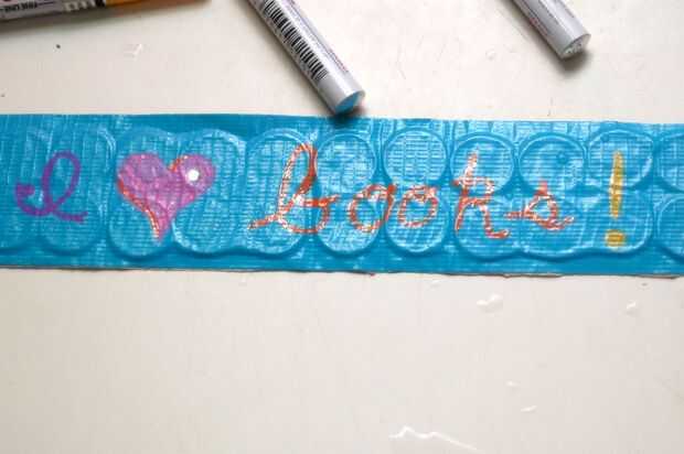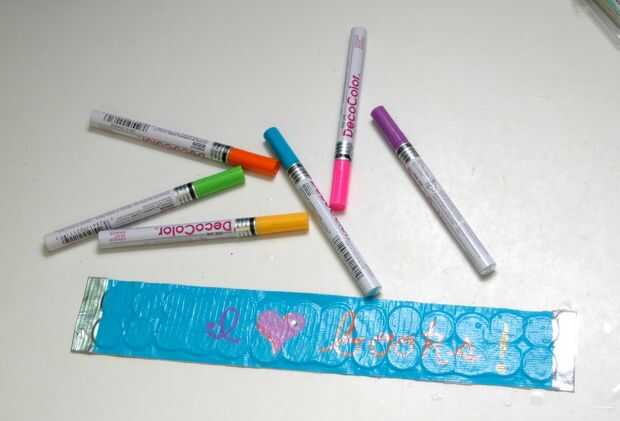 Se ha añadido cinta de plata en los extremos de la mina. Entonces utilicé marcadores de pintura para añadir un mensaje a un lado. Por último, he añadido un Strass adhesivos para un poco chispa.