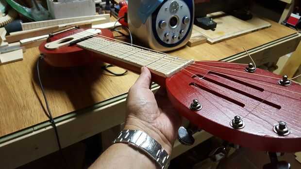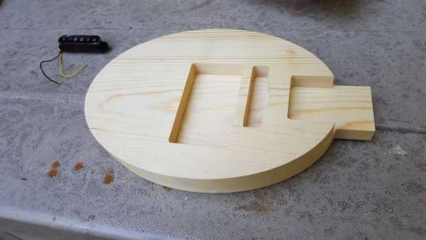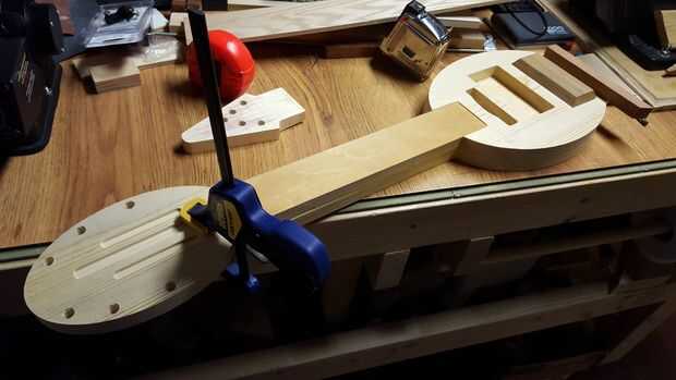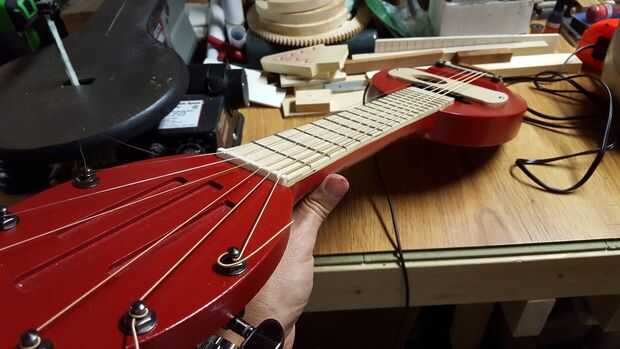 El cuerpo se compone de dos piezas pegadas. El cuello es poner en la ranura del cuerpo y pegado encima. Los trastes se pegan en las ranuras que se cortan mediante un programa CNC gratuito llamado diapasón en www.LoboCNC.com. (traste distanciamiento puede ser encontrado en cualquier número de traste en línea calculadora programas como www.stewmac.com y cortan manualmente)