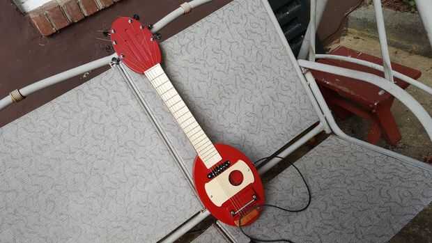 Usé sin control de volumen, sin control de tono, sin alma y sin interruptor on/off para esta compilación. Los cables de la pastilla salen directamente a un amplificador antiguo de juguete karaoke que mis hijos superó hace 10 años. Un amplificador real sonaría mucho mejor, pero sorprendentemente la guitarra no suena demasiado cruda incluso con este amplificador de juguete.