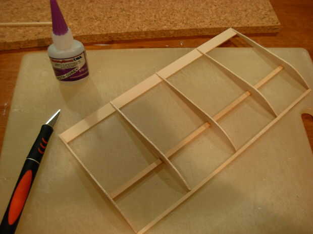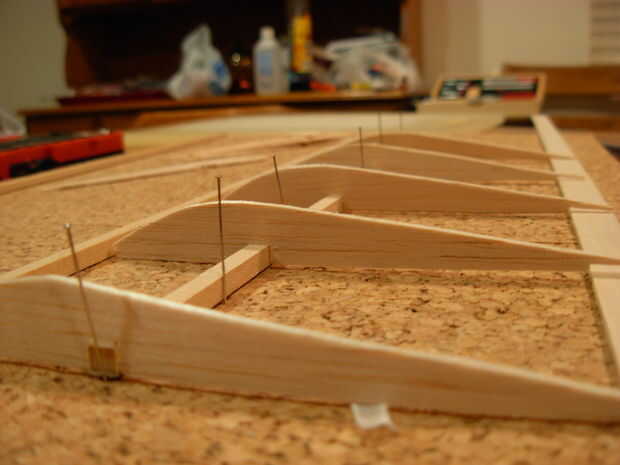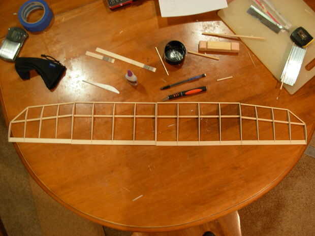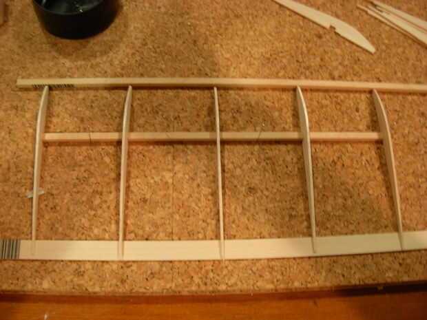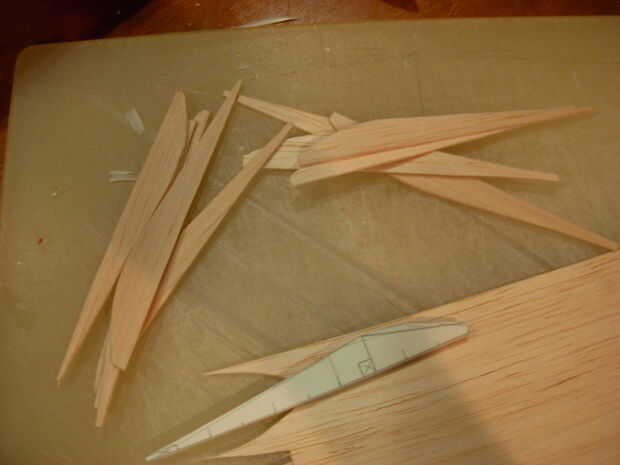 Inician con el corte de la forma básica de las costillas, un stencle es agradable. Luego volver y cortar ranuras de spar, líder y borde de fuga. En este caso el larguero empieza en 1 1/2" del borde de ataque de te. Corte el tilo 1/8" spar spar en 10" de longitud y CA a las costillas en 2 1/2" espacio entre cada costilla. Ayuda si usted seco entra todo primero para no tirar el pelo hacia fuera más adelante (confía en mí...) Entonces CA 1/16" Tilo tira alineándola con uno de los extremos hacia el frente, esto es su borde de ataque. Recortar la tira de exceso en el otro extremo. Luego repita el mismo proceso con la tira de balsa de 1/32 x 1/2" en el borde de fuga del ala, corte el exceso como antes. Ahora debe tener un segmento de 10" de su ala. Repita para el otro lado del ala.