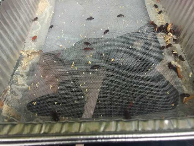 12. pantalla pegada a una bandeja para hornear corte permite su caca al caer sobre una bandeja de captura a continuación. Otros recipientes mantienen las larvas y escarabajos (adaptados de este Instructable gran).