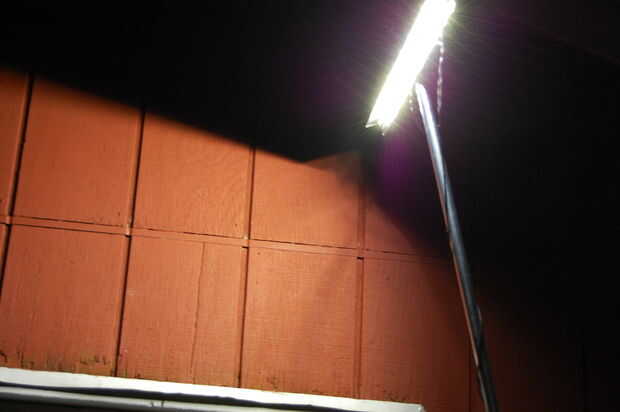 He construido dos luces de estadio. Colocados en lados opuestos del campo hacen un buen trabajo de iluminación de una zona de práctica de tamaño decente para los niños de 10-12. Un campo mayor o diverso deporte, puede que necesite varios más. Cada luz dibuja ~.750 amperios, el paquete Dewalt es bueno para 2,3 amp-horas o 3 horas no del todo. Aún más de lo suficiente para la práctica.