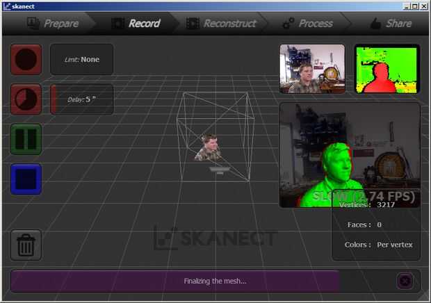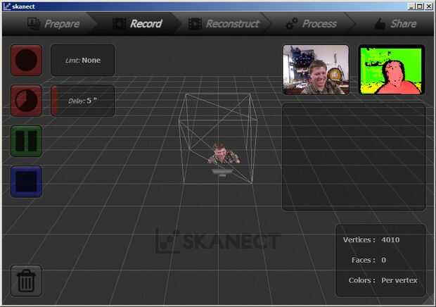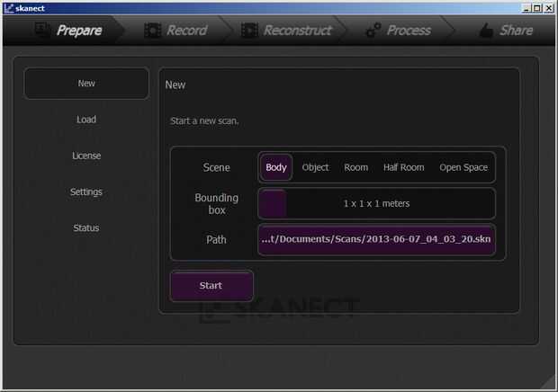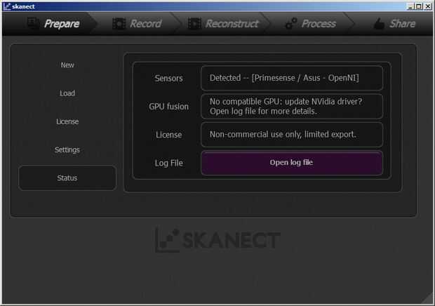 2. Asegúrese de que el sensor se detecta, si no, compruebe que el usb y cable de alimentación estén conectados, y que ha instalado los controladores. Trate de desconectar, dejar el programa, conectarlo, luego volver a empezar Skanect