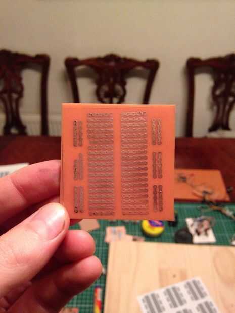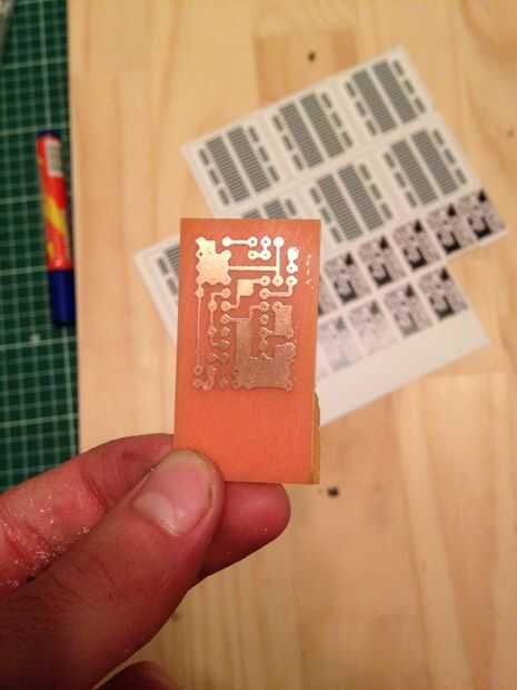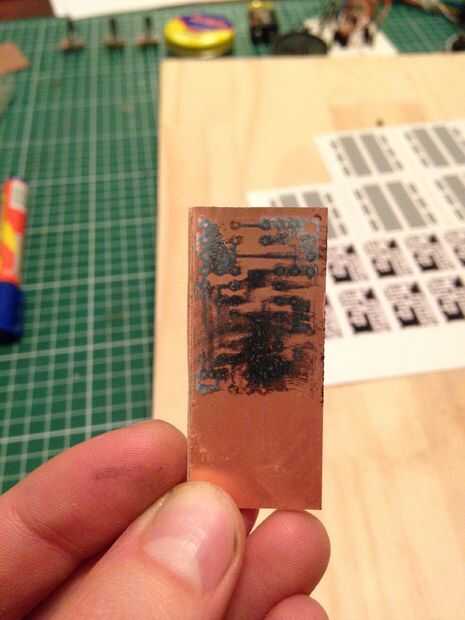 Cuando el papel ya salio por completo, se deja remojar en la solucion de cloruro ferrico, tenemos ir revisando constantemente y batiendo suavemente para actue un poco mas rapido y mas parejo. La solucion consumira todo el cobre de la placa en unos diez minutos, solo se vera la tinta por ahora, pero debajo de la tinta el cobre sigue intacto. Por ultimo, la tinta se limpia usando diluyente comun de pintura.