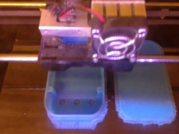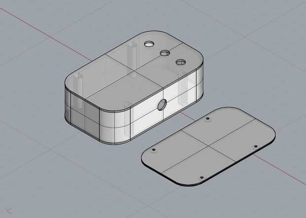 Para la carcasa, busque fuera lo mas compacto posible, ademas de combinar las tecnologías de prototipado en 3D. El modelo hecho en rinoceronte fue impreso en una Makerbot Replicator 2 X. En el diseño original, la tapa trasera iba unida a la carcasa con tornillos de 2 mm de hilo y una cabeza de 5 mm. Pero en la practica, opte por una tapa metálica en la parte trasera. La carcasa tomo alrededor de dos horas en imprimir, y uso 50 gramos en plastico ABS. La carcasa es de 10 x 6 x 3 cm.