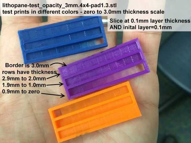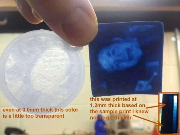 Este ornamento se basa en los diferentes grosores de plástico y la luz interior para crear la imagen que se verá. Saber un poco de opacidad del plástico (cuanta luz está bloqueada) le ayudan a conseguir un buen imprimirá cada vez. Puesto que cada color del plástico tendrá una opacidad diferente, he hecho una pequeña prueba impresión para usted.