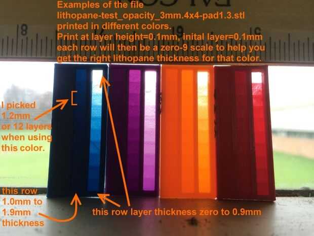 Cada fila es un 0 - escala de opacidad de capa de 10mm. Sostenga la luz para ver en que grueso la luz deja pasar. Hizo ir hasta 3mm de espesor, ya que algunos de los colores de plástico transparentes sería capaces de ir tan lejos.