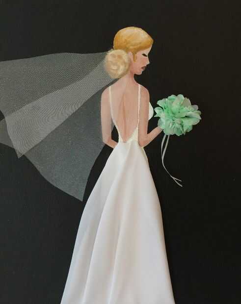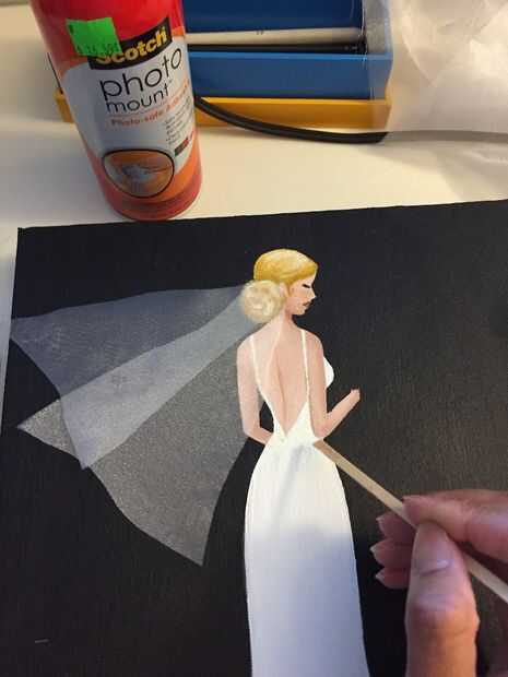 1. En esta boda 3d arte de la lona, después de un velo de la novia, pegué en con foto montaje pegamento. Pensé que ya que es claro y ligero no demostraría a través el velo puro o la tela de seda de la bata demasiado. No rocíe directamente sobre el lienzo, pulveriza sobre un trozo de papel de desecho y luego de utilizar un mezclador de café madera para sacar con pala encima de algun pegamento y aplicó directamente sobre el terreno en el lienzo donde se coloque la tela.