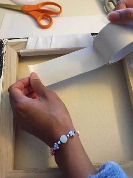 2. Una vez que coloca a la tela a lo que quería, pegué en colocando unos puntos de pegamento directamente en la baja espalda taponando el pegamento del aerosol en el mezclador de madera café. Luego envuelve el pie del vestido alrededor a la parte posterior de la tela y luego la grabó en el hueco en la parte posterior del marco con cinta adhesiva blanca. Pensaba envolver al tejido debajo de la lona y en la parte de atrás era una buena manera de evitar tener que cortar el vestido directamente en la parte inferior de la tela---que parecería antiestética si realmente no estaba cercado. No tenía ni idea de como se vería, pero, al final, resultó muy hermoso!