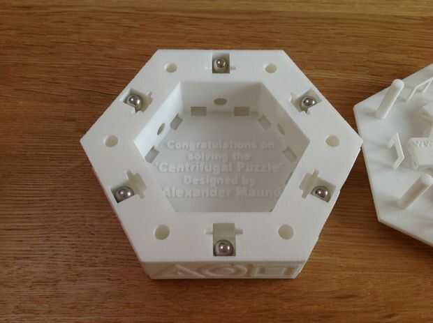 Centrífuga caja rompecabezas (estos diseños fueron impresos a través de una empresa llamada Shapeways con sede en los países bajos y Nueva York, también se puede comprar una copia y 3D impreso para usted aquí vía Shapeways)- Este es un único de un cuadro de tipo 3D rompecabezas impreso que puede almacenar cualquier cosa con dimensiones de menos de 39x39x13mm que se abre/se soluciona de una manera intrigante, girando simplemente el puzzle caja sobre una superficie plana se abre la tapa, sin embargo esto no está hecho para ser obvio: