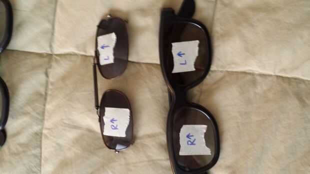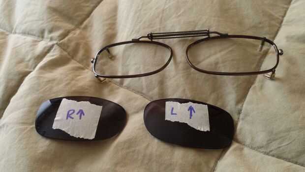 Luego, utilizando un marcador, escriba qué lente es izquierda y que es justo en cada par y dibuja una flecha apuntando hacia arriba en cada pieza. No tiene que ser perfecto pero intento ser lo más preciso posible, las flechas en cada lado del mismo lente deben apuntar en la misma dirección. Esto es importante por dos razones: