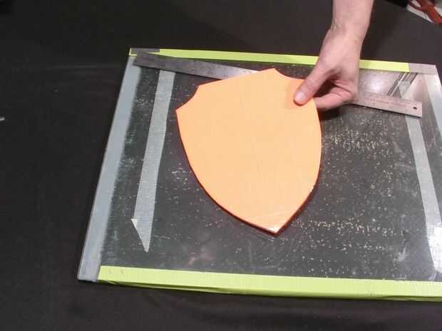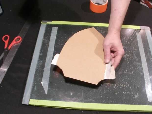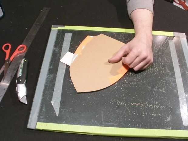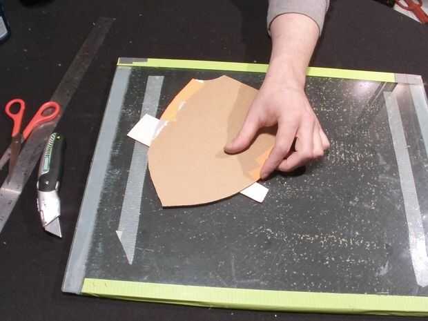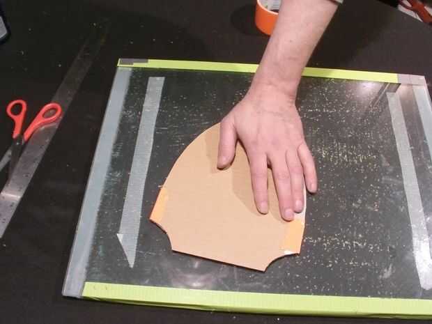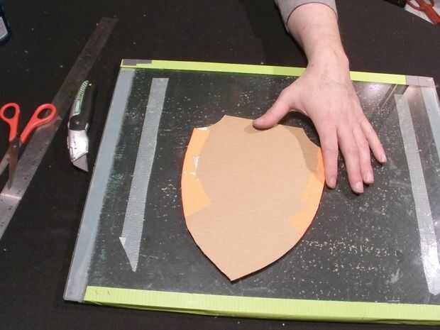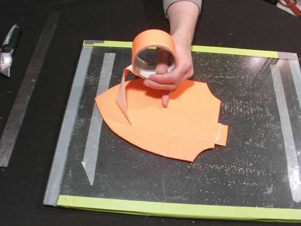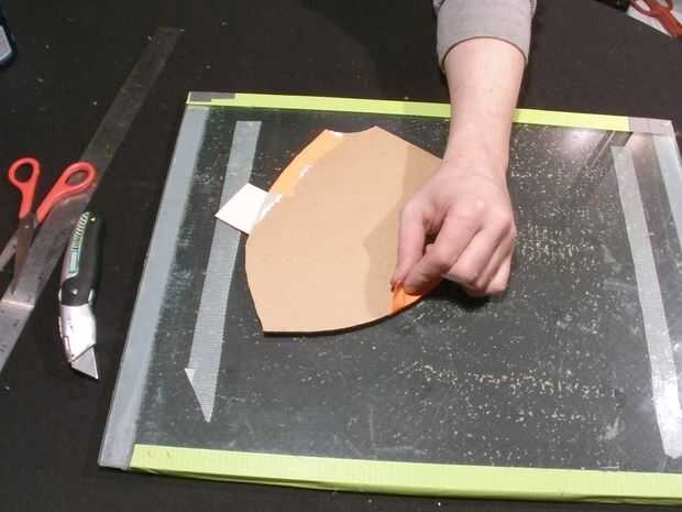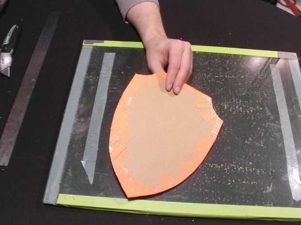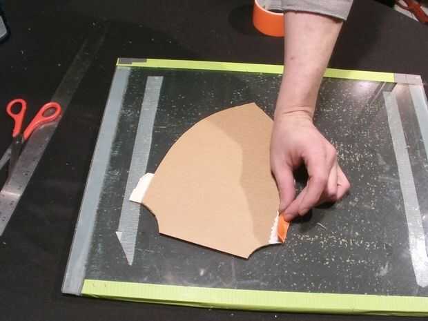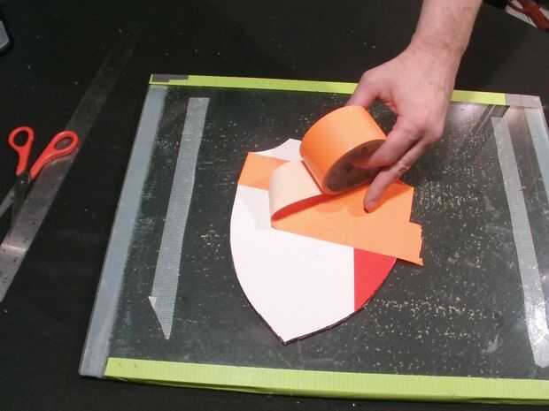 3. Cinta lisa y tirón sobre la doblez sobre la cinta a cada lado para las piezas en forma de escudo, hacer pequeños cortes en la cinta donde sobre cuelga a acomodar las curvas antes de plegar más a la parte posterior de la pieza. Para ciervos pedazos recorte cualquier exceso colgante cinta al ras con la cartulina.