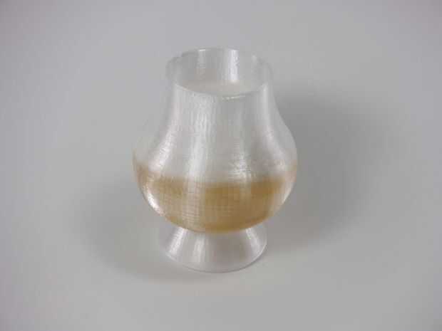 En colaboración con Asador Granjero urbano en Portland, Oregon, nuestro makerspace fue dado la oportunidad de probar un nuevo filamento de Vidrio HD que se anuncia como transparente, "contacto de alimentos y bebidas aprobado," y podía imprimir como PLA. Nuestro primer proyecto fue un vaso de whisky del estilo de Glencairn para ver cómo realiza el filamento, así puede almacenar líquido, y cuán transparente es realmente el material. En primer lugar, el modelo 3D fue creado en Autodesk Inventor (una versión libre del estudiante puede descargarse aquí) y los ajustes necesarios para el Makerbot Replicator 2 y espesor de la pared se encontró a través de ensayo y error. La. Archivo STL puede descargarse a continuación.