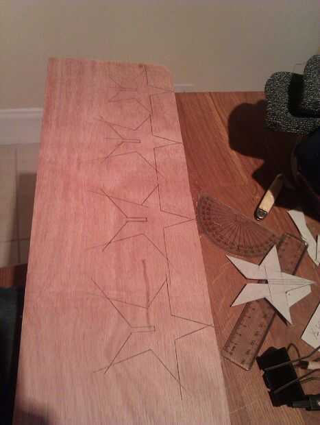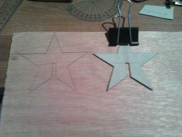 Utilizar un clip de la carpeta, o similar, para mantener la plantilla en su lugar. Tomar una pieza de marcado y rastreo alrededor de la plantilla. Para una estrella 3D, debe tener 2 estrellas trazados (ver imagen 1).