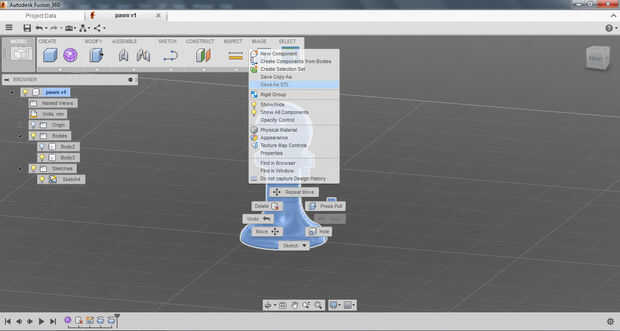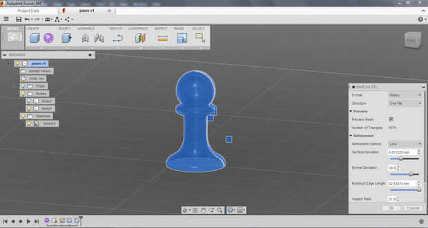 Una vez que estés feliz con tu forma de fusión es el momento de exportar como una malla STL para posterior modificación e impresión. Haga doble clic en el cuerpo para seleccionarla (dará vuelta al azul). Haga clic derecho y seleccione Exportar como STL. Un diálogo de opciones se están en el lado derecho del marco. No es necesario exportar el formulario con una cantidad loca de detalle ya que vamos a modificar en el paso siguiente, seleccionar el nivel de detalle medio o bajo y salvar a la STL.