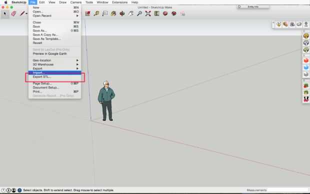 Este paso es muy simple, pero hay algunas cosas que debe saber. Cuando haya terminado con tu creación en SketchUp simplemente haga clic en la pestaña archivo, haga clic en la "exportación de STL..."