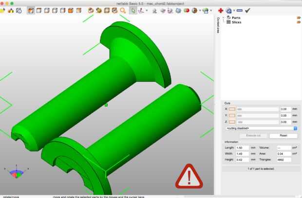 Así que dicho esto, ahora es el momento para abrir tu archivo STL en su copia de netfabb Basic. Una vez que se carga el modelo no se sorprenda si usted ve el triangulo con signo de exclamación en la parte inferior derecha de su modelo en la pantalla. Esto significa que se han encontrado errores "fugas".