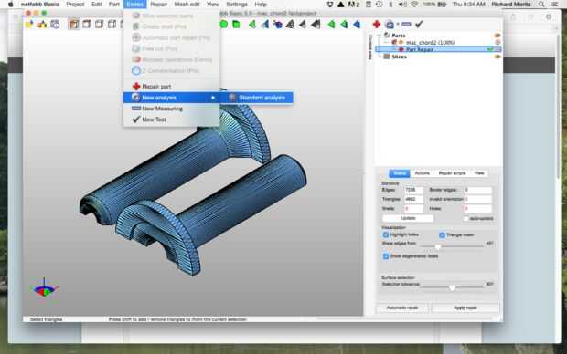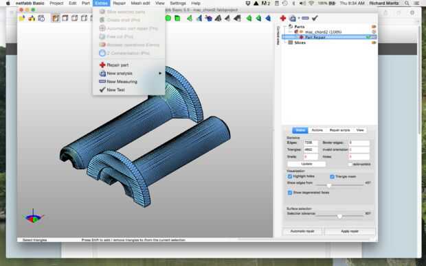 Situado bajo el icono de "Reparación" en la pestaña de "Extras" es un icono con la etiqueta "Nuevo análisis" haga clic sobre este para revisar el modelo recién reparado. A la derecha de la pantalla aparecerá un informe de análisis que indica, entre otras cosas, el número de agujeros y el tiempo en que la superficie es cerrada.